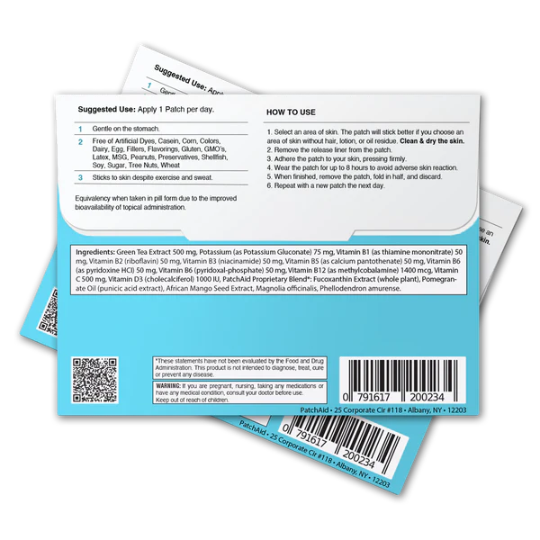 It contains the active compound, called hydroxycitric acid (HCA). It has been studied for its effects on fat and sugar metabolism. Our Metabolism Plus Topical Patch also contains fucoxanthin (brown seaweed), pomegranate oil (punicic seed extract), and African mango seed extract.