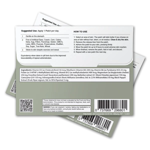 The Migraine Relief Patch from PatchAid has a range of ingredients to support migraine relief in many ways. For example, vitamin B2 (riboflavin) may support healthier metabolism among brain cells, and magnesium may allow for improved muscle relaxation. Ashwagandha is another relaxation-promoting ingredient. Butterbur and feverfew are taken to prevent migraines, and Coenzyme Q10 is taken to reduce the frequency of headaches.