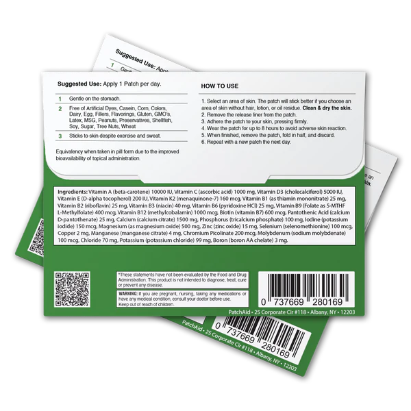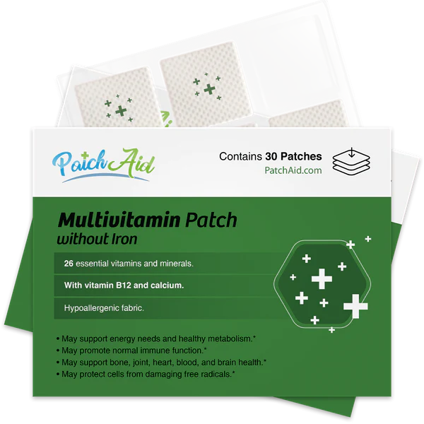 PatchAid MultiVitamin Plus Topical Patch without Iron has a unique formula with 26 essential vitamins and minerals. It is designed to contain nutrients that may not be high enough in your daily diet to provide you with optimal amounts.