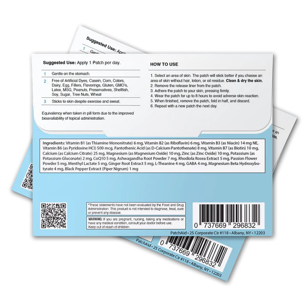 The patch has plenty of natural supplements that are used for relaxation. For example, ashwagandha is known as an anti-stress supplement, and GABA is a neurotransmitter that reduces signals in the brain, and low GABA levels are linked to depression and reduced mood stabilization. Ginger is an anti-nausea aid.