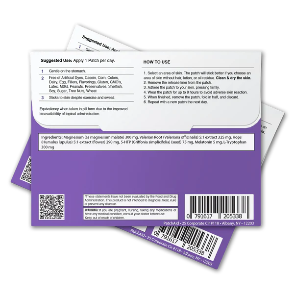 If prescription or over-the-counter medications feel a bit extreme, PatchAid Sleep Aid may be your answer. It is specially formulated to promote healthy sleep in a non-habit-forming way. It has natural ingredients such as melatonin, which is a natural sleep hormone in your body. PatchAid Sleep Aid also has L-tryptophan and 5-HTP, which help make neurotransmitters that regulate sleep. Valerian root is an herb commonly used for sleep.