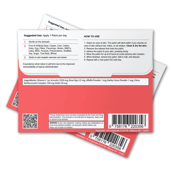 PatchAid Vitamin C Plus Patch has another advantage – the “extras.” Eat an orange, and you are unlikely to get the full advantages since it is that peel that contains the potent bioflavonoids. PatchAid Vitamin C Plus Patch has citrus bioflavonoids, along with rosehip, alfalfa, and barley grass powder, and another flavonoid called rutin.